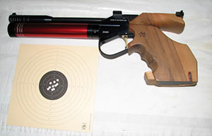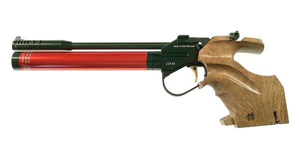 10 metre air pistol is an Olympic event. Shooters use a .177 calibre pellet pistol, with top-quality guns costing as much as a .22LR match pistol. Most are powered by compressed air or CO2 and load a single pellet at a time.